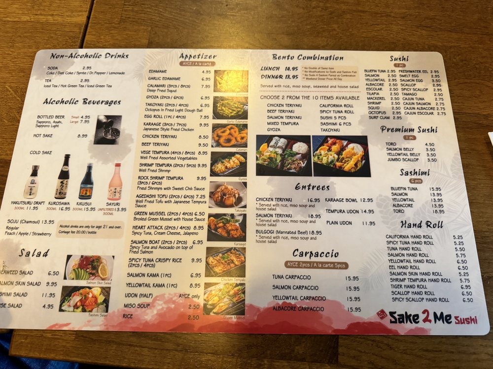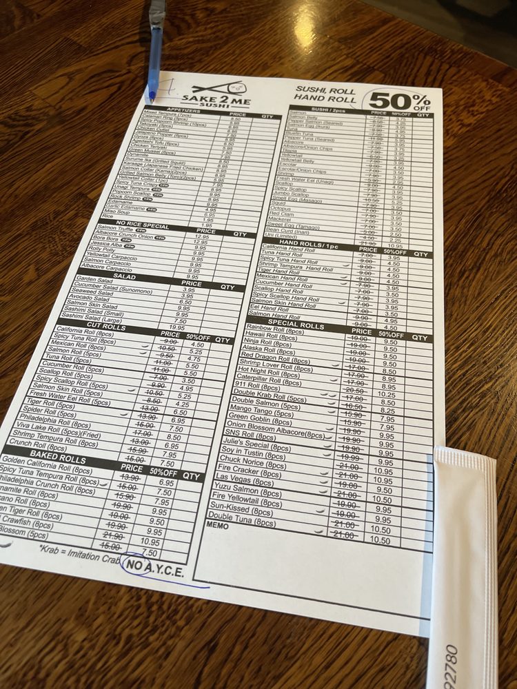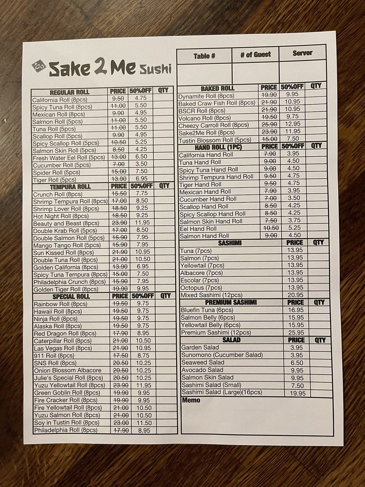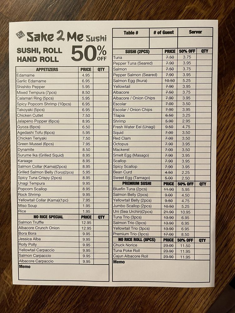 Introducing Sake 2 Me Sushi, a vibrant restaurant in Tustin, CA, offering a diverse menu with options for everyone. From appetizers like garlic edamame and jalapeno popper to unique rolls like Jessica Alba and Rolly Polly, there is something for every palate. The fresh fish and flavorful dishes have garnered praise from customers, with favorites like the 911 Roll and Salmon Truffle standing out. The 50% off sushi deal makes it affordable to try a variety of rolls, and the efficient service ensures a pleasant dining experience. With a lively ambiance and attentive staff, Sake 2 Me Sushi is a standout choice for sushi lovers looking for quality and value.